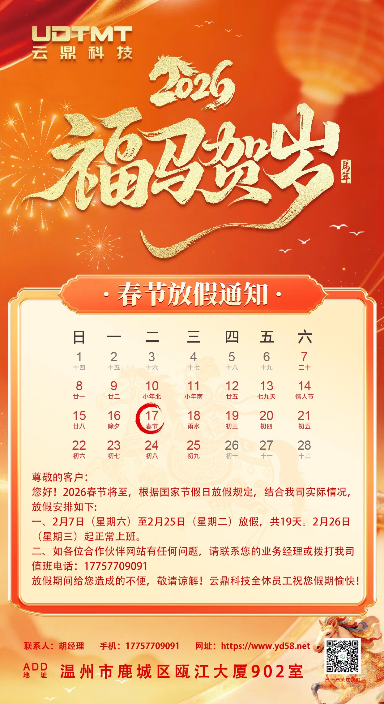 二、如各位合作伙伴网站有任何问题,请联系您的业务经理或拨打我司值班电话:17757709091放假期间给您造成的不便,敬请谅解!云鼎科技全体员工祝您假期愉快!